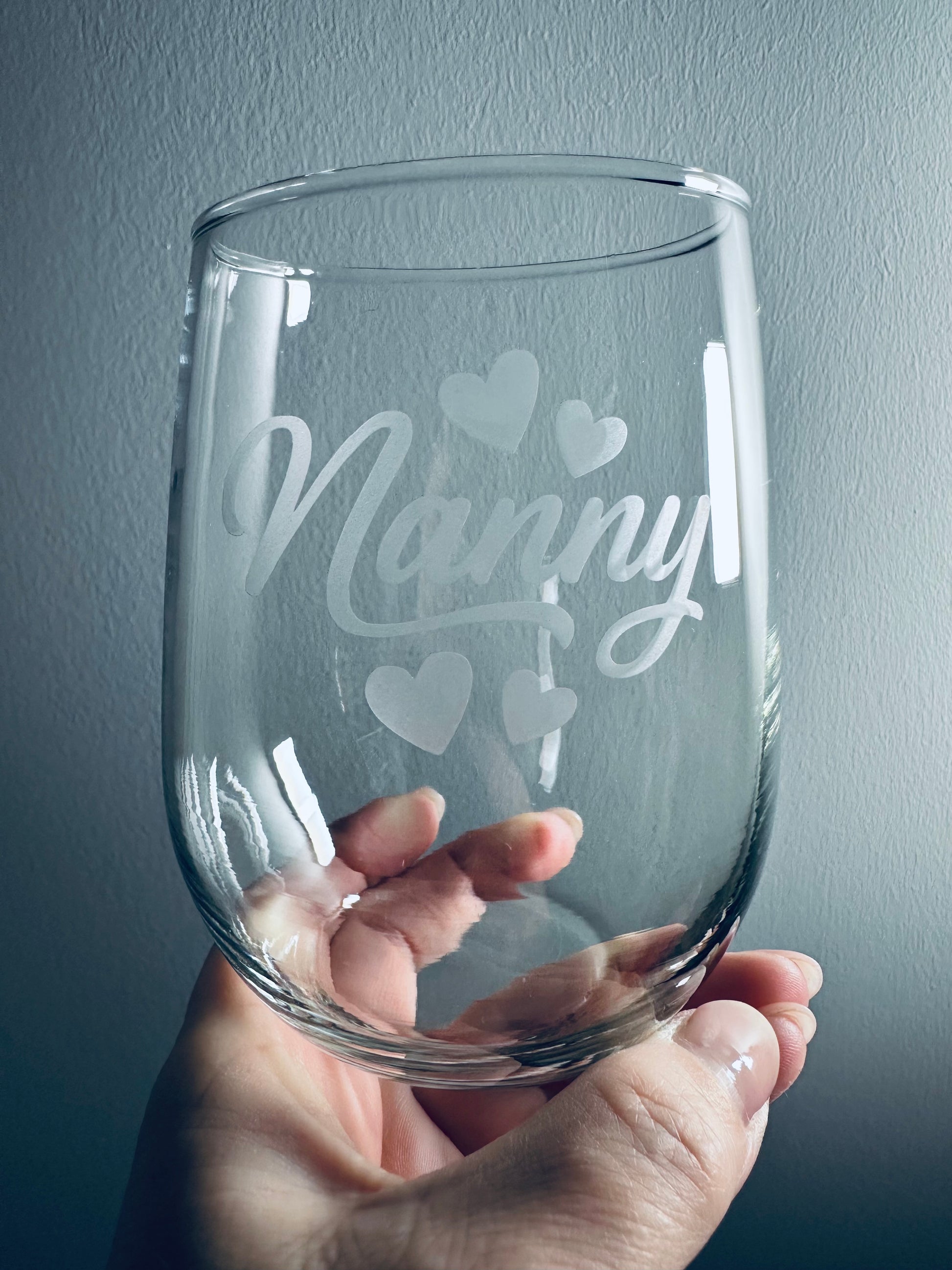 Celebrate the special Nanny in your life with this sweet etched stemless wine glass. Adorned with soft floating hearts and elegant script, it’s the perfect way to show love and appreciation for someone who means so much.