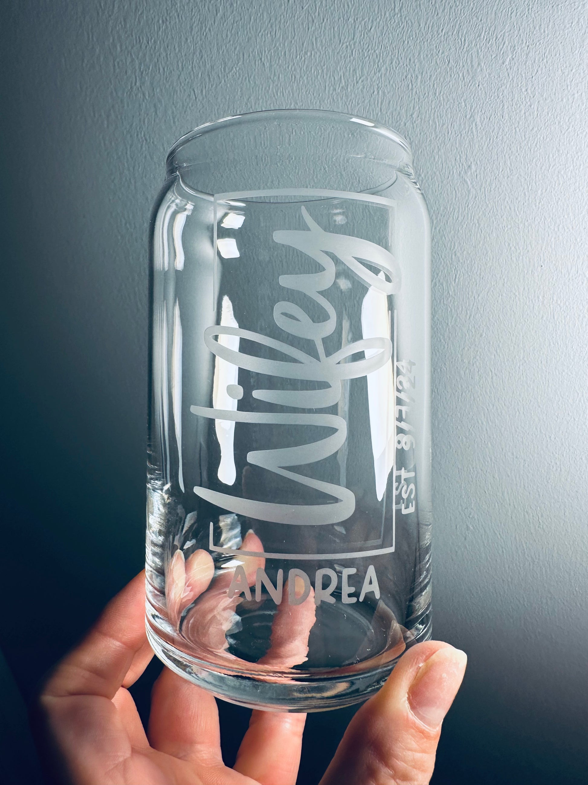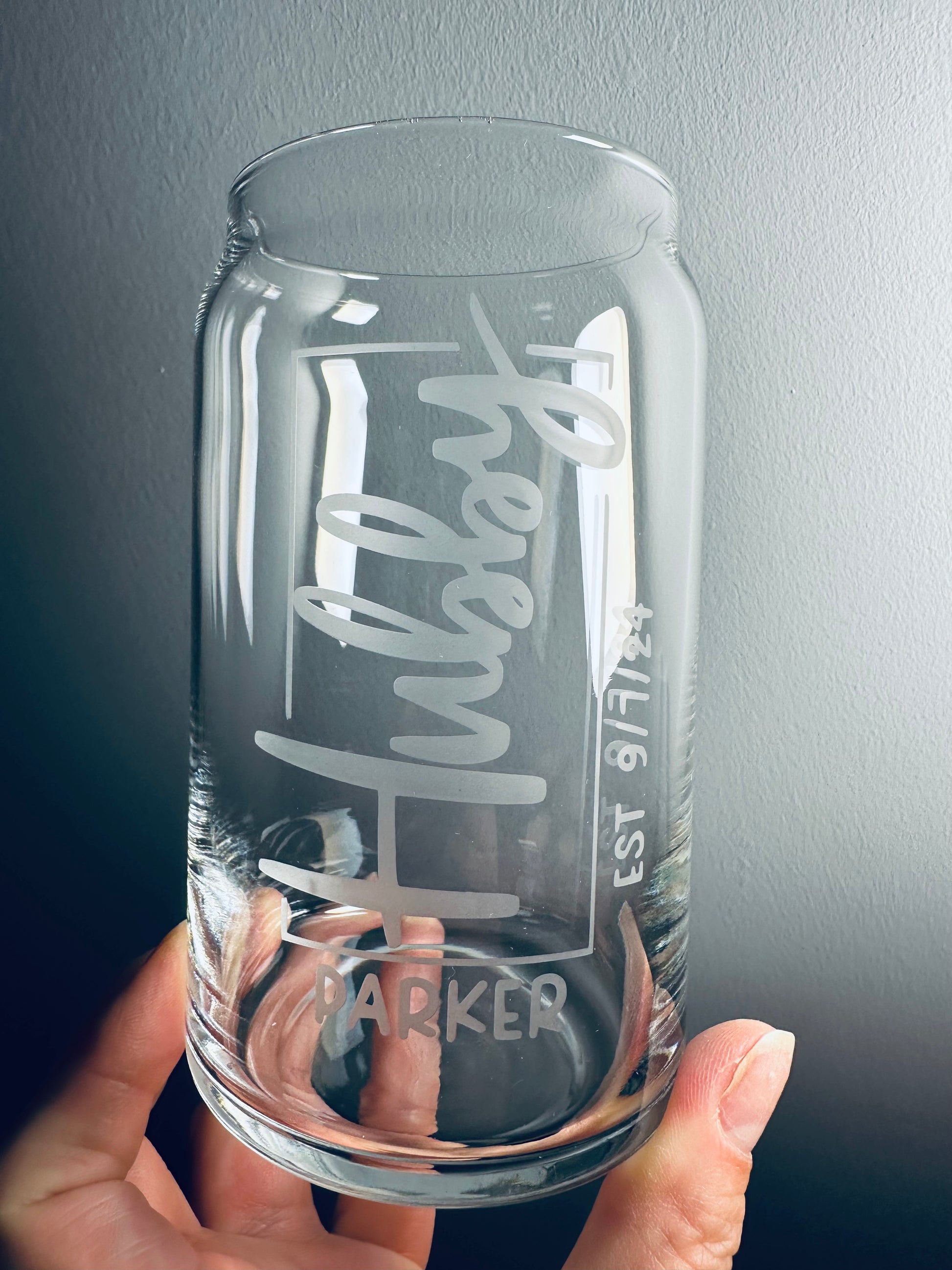 Perfect for weddings, anniversaries, bridal showers, or just because — these 16 oz can glasses are personalized with your names and special date, making them a treasured keepsake.